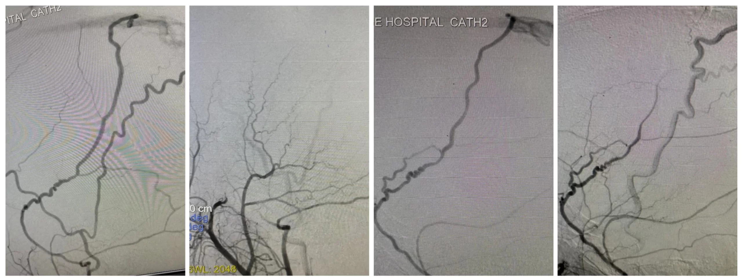 After super selective angiograms, both MMA feeders showed multiple tight loops. On the left the microwire straightened the loops and Asahi parkway went close to the fistula. On the right it wouldn’t negotiate a mid proximal very acute loop. I went on to embolize both sides with glue achieving complete obliteration.